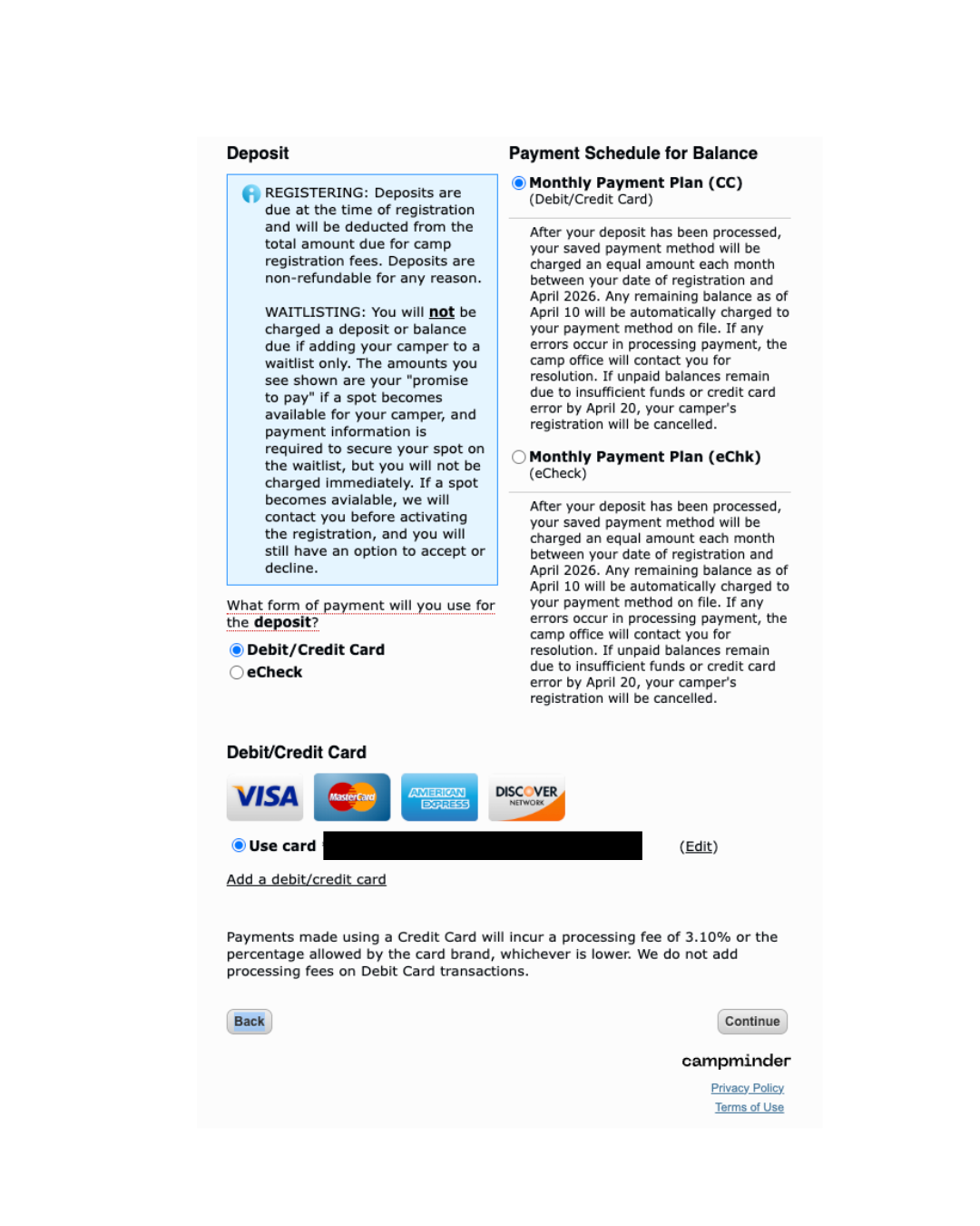 If you pay only the deposit at the time of registration, the remaining balance will automatically be set up on a monthly payment plan. Under payment schedule, choose either the “Debit/Credit Card” option to use a card or the “eCheck” option to use a checking account.