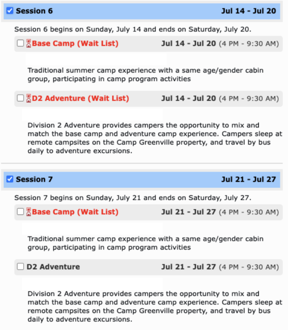 If a particular program is full, it will show the title in red and say “(Wait List)” in the title. You may click the box next to it to add your camper to the waitlist.