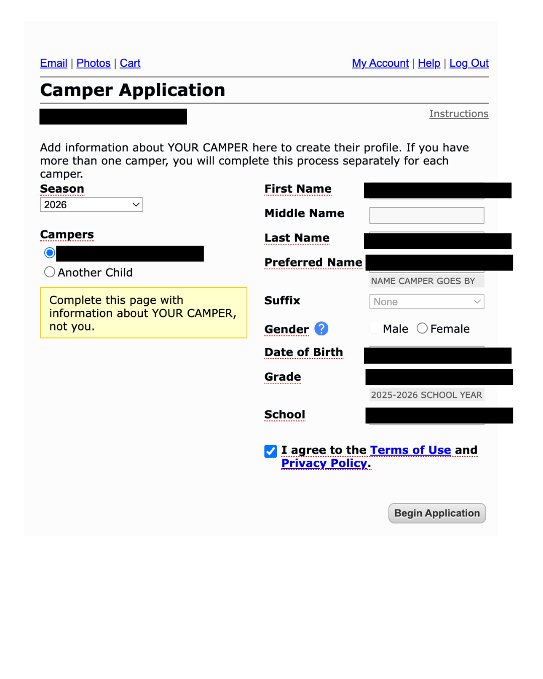 To register another camper, click “Begin New Application”.