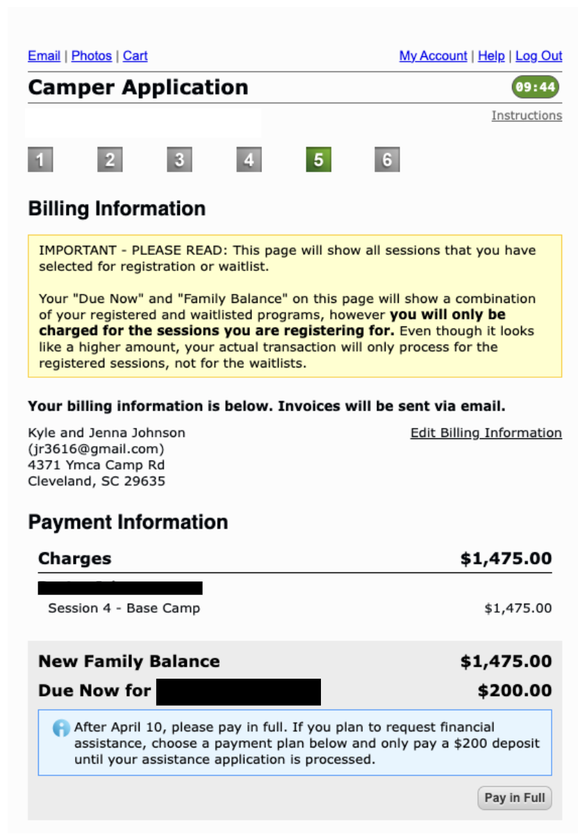 Notice that “due now” includes a $200 deposit per session you are registering for.