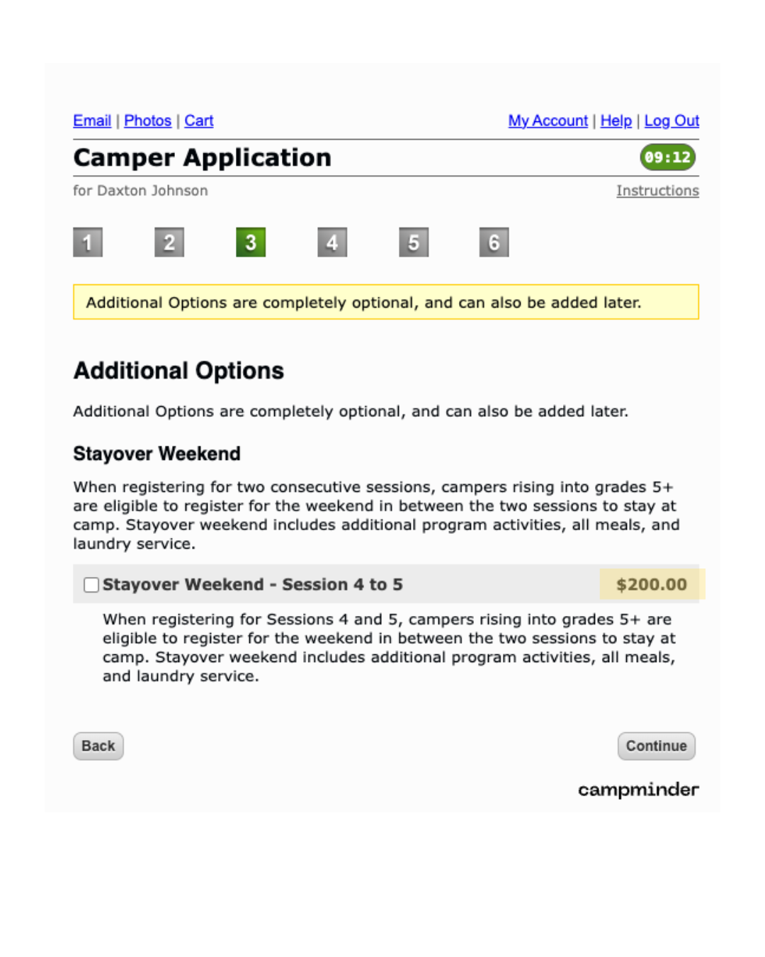 The additional options page will appear for Division 2 and older campers. It provides the option to register for the Stayover Weekend program.