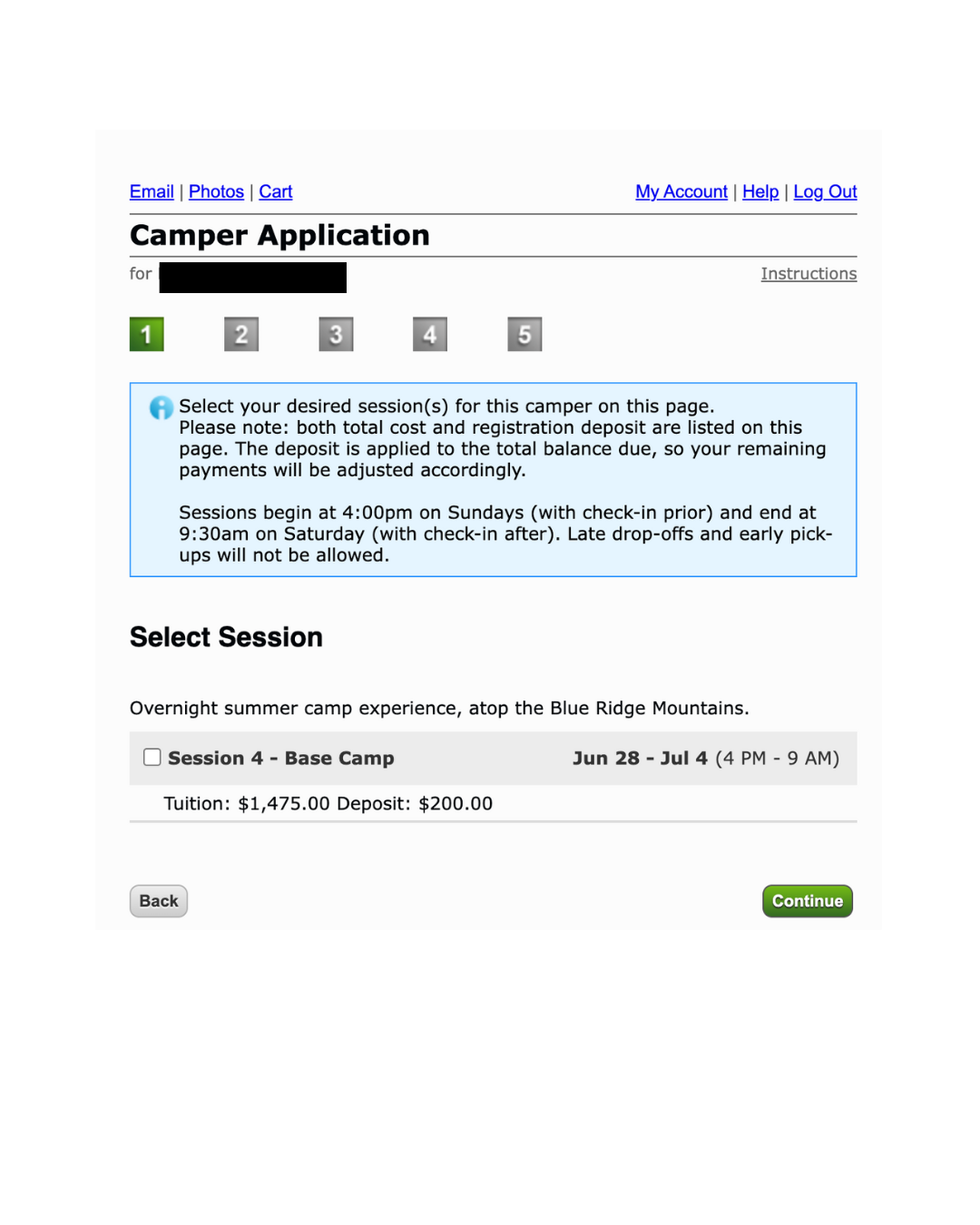 Click the box next to your camper’s preferred session/program to select it.