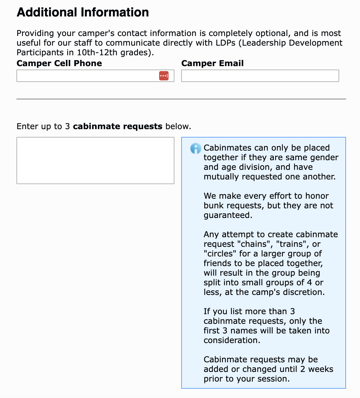It is optional to add your camper’s contact information here, including Camper Cell Phone and Camper Email. This is not required, and completely optional. This information is most helpful for camp to have for LDPs (Leadership Development Participants in 10th-12th grades).